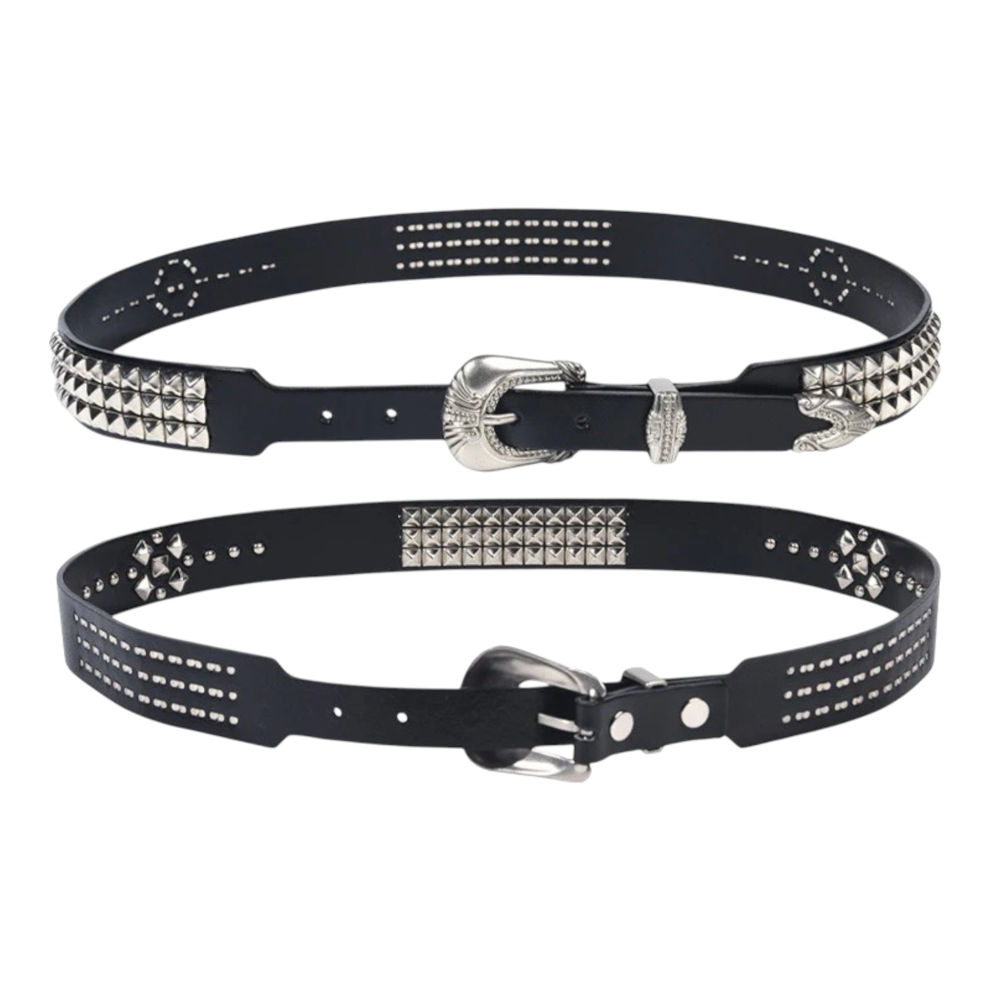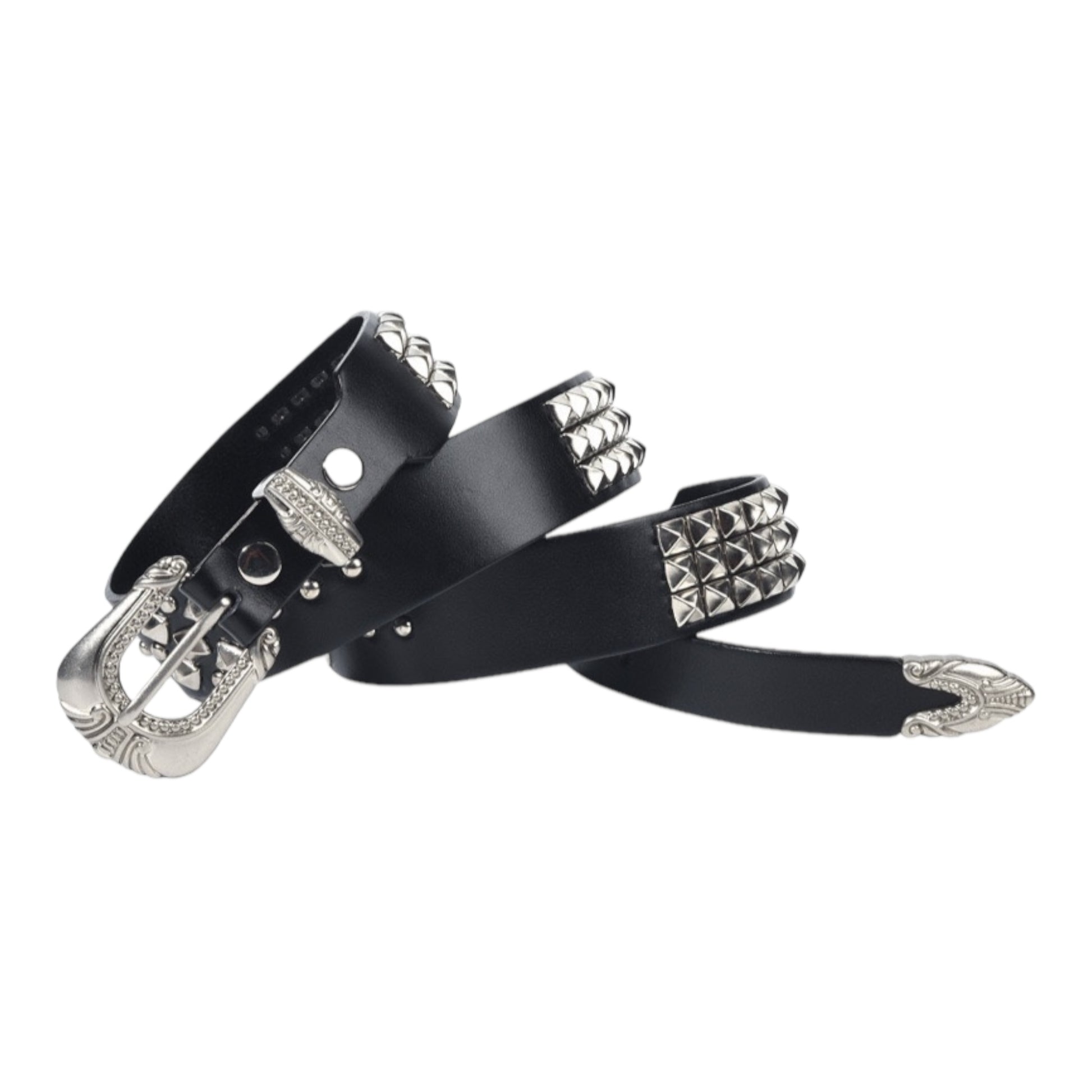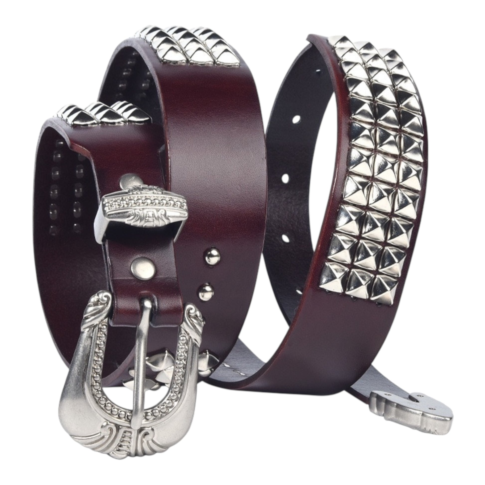 FORGE CLASSIC WESTERN FLAIR WITH A MODERN EDGE. VANGUARD PAIRS PREMIUM, VEG-TANNED COWHIDE WITH HIGH-SHINE SILVER PYRAMID-STUD PANELS AND A SCULPTED 3-PIECE BUCKLE SET -- BUCKLE, KEEPER, AND TIP -- ETCHED IN VINTAGE SCROLLWORK. UNISEX SIZING
